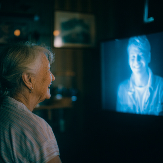 ![]() AI가 자녀 얼굴과 목소리를 형상화해 안심마을에 거주하는 부모와 대화하고 있다. <AI 생성이미지> |