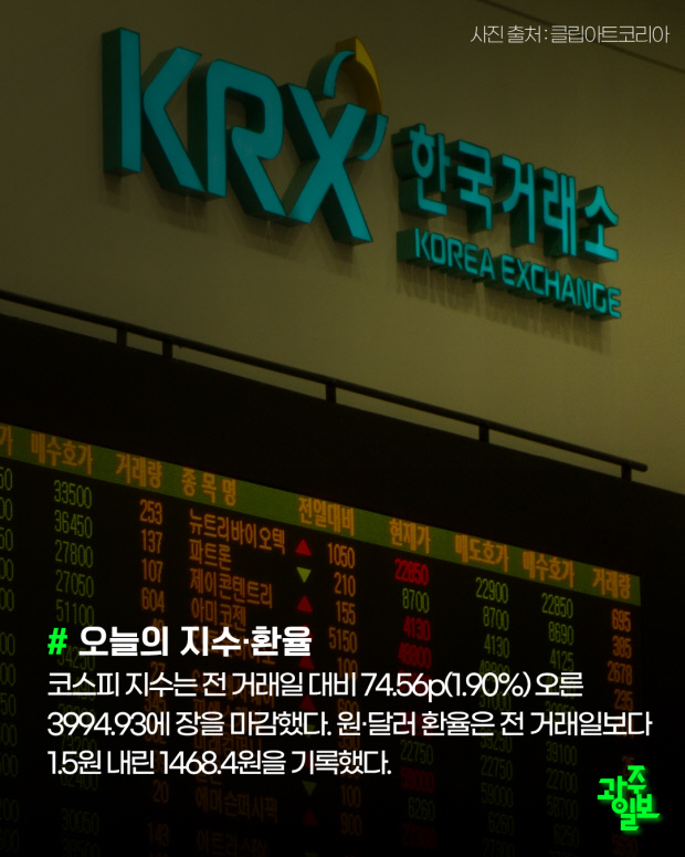 코스피 지수는 전 거래일 대비 74.56p(1.90%) 오른 3994.93에 장을 마감했다. 원·달러 환율은 전 거래일보다 1.5원 내린 1468.4원을 기록했다.