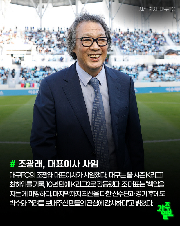 대구FC의 조광래 대표이사가 사임했다.대구는 올 시즌 K리그1 최하위를 기록, 10년 만에 K리그2로 강등됐다. 조 대표는 “책임을 지는 게 마땅하다. 마지막까지 최선을 다한 선수단과 경기 후에도 박수와 격려를 보내주신 팬들의 진심에 감사하다”고 밝혔다.