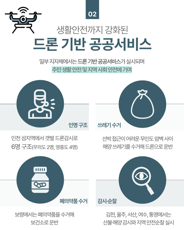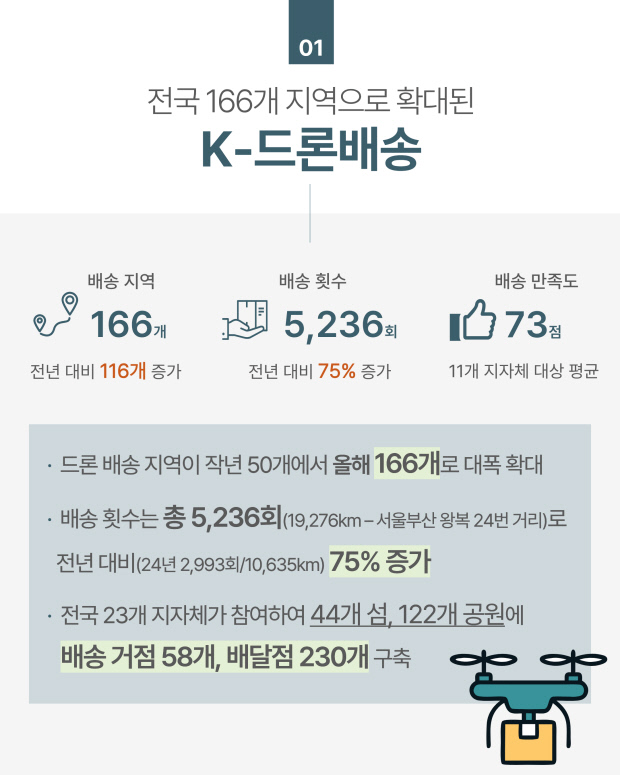 국토교통부는 시행 2년차 K-드론배송 운영 결과, 배송지역이 50개에서 166개로 확대되고 배송횟수가 전년 대비 75% 증가했다고 밝혔다. 배송 서비스와 더불어 드론을 활용한 해안 감시 등의 공공서비스도 확대되어 지역 안전에 기여한 것으로 나타났다.
