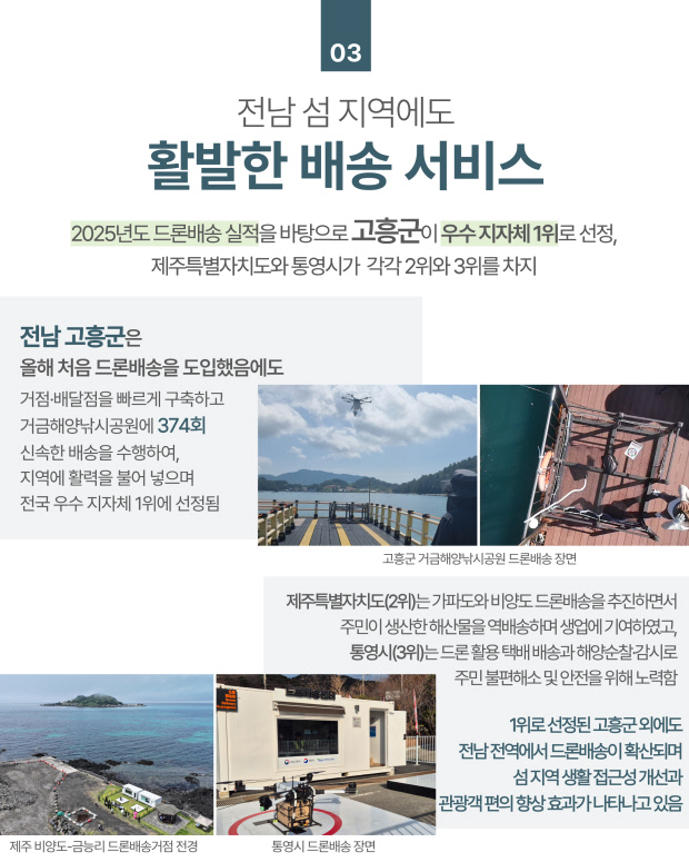 2025년 드론배송 실적 평가에서 전남 고흥군이 우수 지자체 1위, 제주특별자치도와 경남 통영시가 각각 2위와 3위로 선정됐다.
