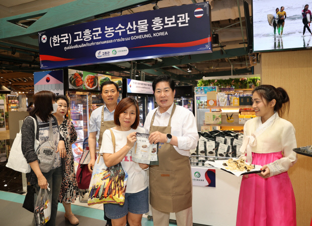 ![]() 고흥군이 해외시장개척에 활기를 띄고 있는 가운데 공영민(오른쪽에서 두번째) 군수가 태국홍보관에서 고흥특산품을 홍보하고 있다. <고흥군 제공> |