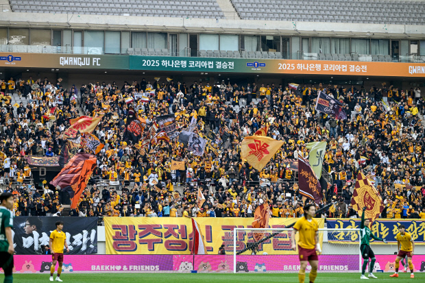 ![]() 지난 6일 서울월드컵경기장 열린 광주FC와 전북현대의 2025 코리아컵 결승전에서 광주 팬들이 뜨거운 응원을 보내고 있다. <광주FC 제공> |