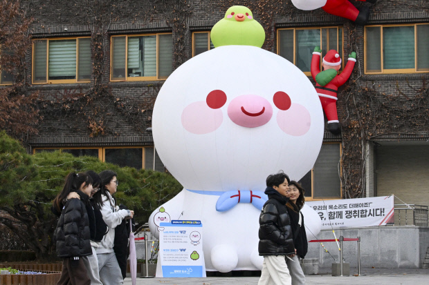 15일 광주 북구청 광장에 북구 공식 캐릭터인 ‘부끄’ 대형 조형물과 산타클로스 장식이 설치되어 연말 분위기를 연출하고 있다. /김진수 기자 jeans@kwangju.co.kr