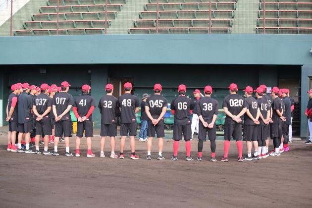 ‘디펜딩 챔피언’에서 ‘8위’로 추락한 KIA가 조용한 12월을 보내고 있다. KIA는 아시아쿼터, 외국인 투수와 타자 그리고 조상우와의 FA 계약을 남겨두고 있다. 지난 11월 일본 오키나와에서 진행된 마무리캠프에서 선수단 미팅을 하는 모습. <KIA 타이거즈 제공>