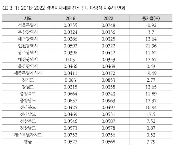 보고서에 따르면 전국 평균 인구다양성 지수는 지난 2018년 0.0527에서 2022년 0.0568로, 7.8%의 증가했다.