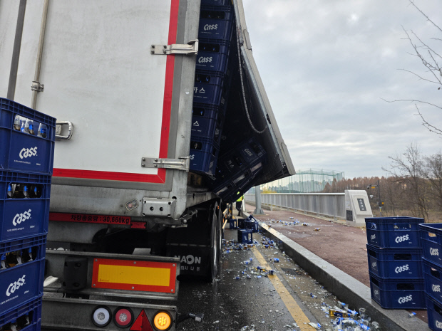 출근시간대 화물차에서 맥주병 100여 상자 쏟아져 도로통제