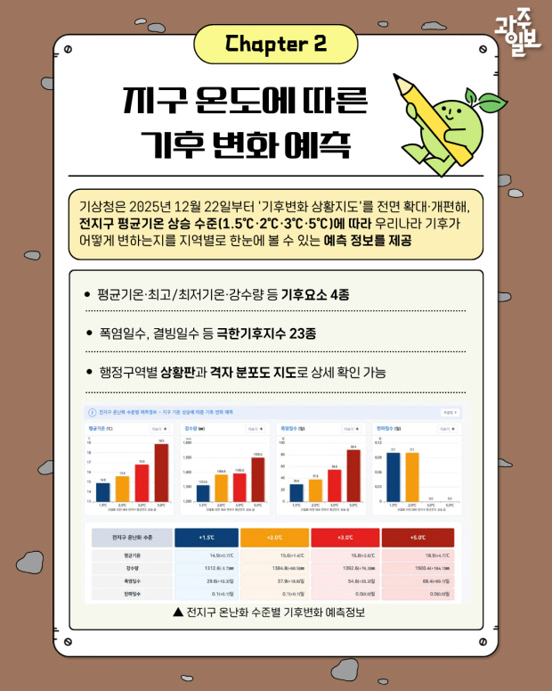 이는 산업화 이전 대비 전 지구 평균기온이 1.5도, 2.0도, 3.0도, 5.0도 상승할 경우 우리나라 기후가 어떻게 변화할지 예측 정보를 제공하는 서비스이다.