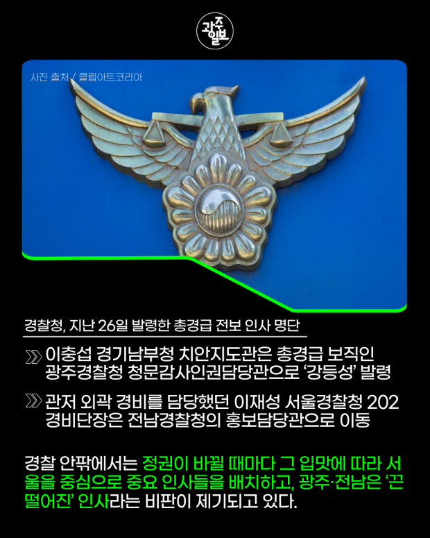경찰 안팎에서는 정권이 바뀔 때마다 그 입맛에 따라 서울을 중심으로 중요 인사들을 배치하고, 광주·전남은 ‘끈 떨어진’ 인사로 발령을 내는 데 따른 비판이 제기되고 있다. 광주경찰청 관계자는 “서울과 가까울수록 요직, 지방으로 갈 수록 한직이라는 인식이 팽배해 있는 것이 현실”이라고 말했다.