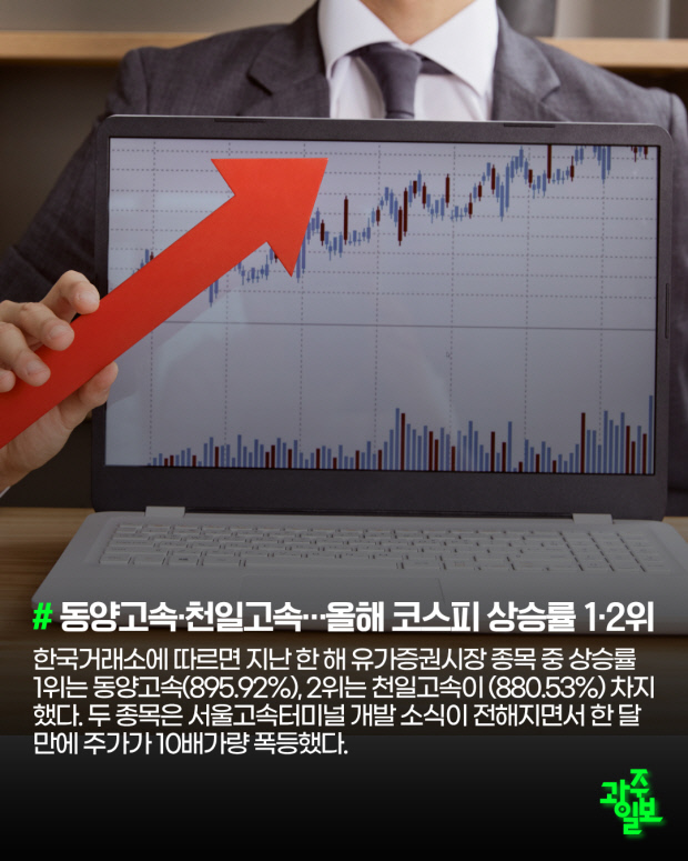 1일 한국거래소에 따르면 지난 한 해 유가증권시장 종목 중 상승률 1위는 동양고속(895.92%), 2위는 천일고속이 (880.53%) 차지했다. 두 종목은 서울고속터미널 개발 호재가 이어지며 한 달 만에 주가가 10배가량 폭등했다.