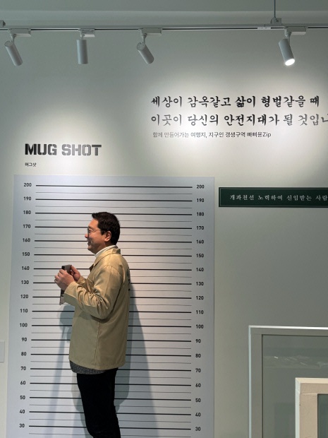 ![]() 장흥 빠삐용 Zip의 포토존에서 관광객이 머그샷 촬영을 체험하고 있다. |