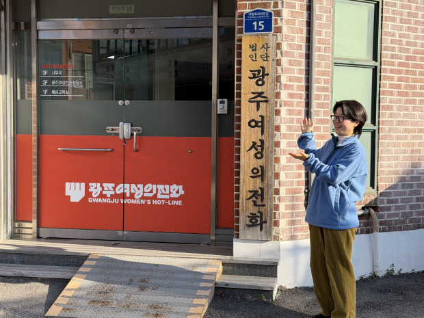 ![]() 3일 한솔 광주여성의전화 활동가가 광주시 서구 농성동 광주여성의전화 사무실 현판을 가리키며 웃어보이고 있다. |