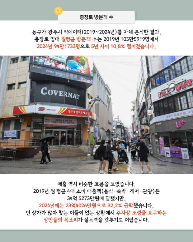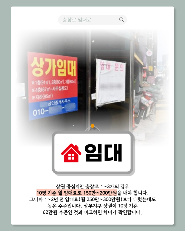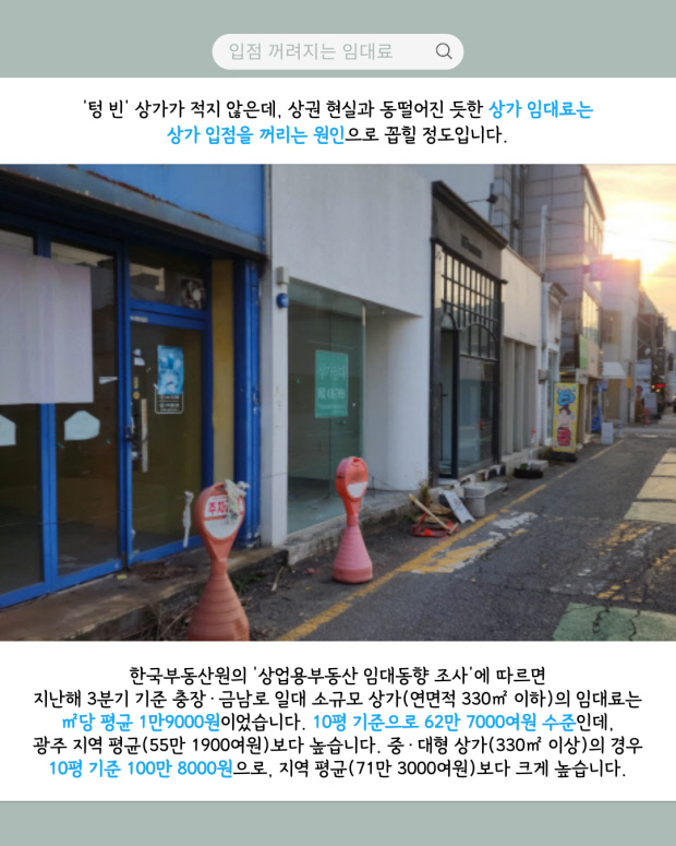 상권 현실과 동떨어진 듯한 상가 임대료는 상가 입점을 꺼리는 원인으로 꼽힐 정도다. 충장로 중심가 임대료는 10평 기준 월 150만~200만 원으로, 지역 평균과 다른 주요 상권보다도 높은 수준이다. 경기 침체와 유동인구 감소 속에서 신규 창업자 유입이 어려워 상권 악순환이 이어지고 있다는 분석이다.