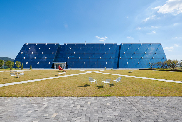 전남 광양에 자리한 전남도립미술관(관장 이지호)을 처음 만났을 때 떠오른 이미지는 ‘야트막한 산’이었다. 파란 하늘 아래 비스듬히 경사진 모습으로 자리한 미술관은 외관을 감싼 푸른 빛의 유리 파사드와 어우러져 현대적인 분위기를 자아냈다. 마침 개관 기념 전시 제목이 ‘산을 등지고 물을 바라보다’였는데, 미술관 이미지와 어울린다는 생각도 했다.
