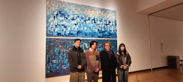 ![]() 시립미술관은 오는 4월 12일까지 ‘한희원과 젊은 영혼들의 만남’전을 펼친다. 한 작가의 그림 ‘생의 파문’ 앞에서 포즈를 취한 노여운 작가, 박성완 작가, 한희원 작가, 손지원 작가. (왼쪽부터) |