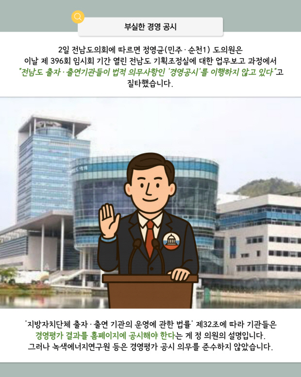 전남도 출자·출연기관들이 법적 의무인 경영공시를 제대로 이행하지 않고, 업무 성과도 전반적으로 부진하다는 지적이 제기됐다. 일부 기관은 경영평가 결과를 홈페이지에 공시하지 않았으며, 녹색에너지연구원과 전남사회서비스원은 2025년 경영공시가 누락된 것으로 나타났다.