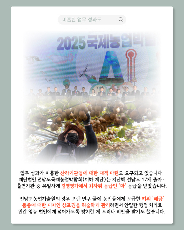 기관별 성과 부족 문제도 드러났다. 전남국제농업박람회는 경영평가 최하위 등급을 받았고, 전남해양수산과학원과 전남농업기술원 역시 연구 성과와 행정 관리 측면에서 미흡하다는 비판을 받았다. 이에 전남도는 하위 평가 기관에 대해 운영비 감액 등 페널티를 부여하기로 했다.