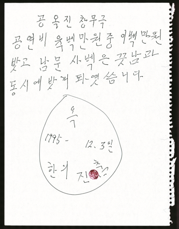 공옥진 여사가 손으로 쓴 계약서. 인주 대신 립스틱을 발라 도장을 찍었다.