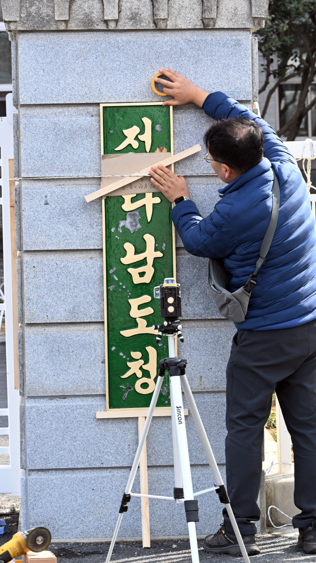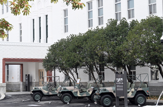 5일 광주시 동구 옛 전남도청 복원 공사 현장에서 시민 체험용 소품인 ‘시민군 지프차’(왼쪽)와 1980년 당시 모습을 재현한 전남도청 현판이 설치되고 있다. 문화체육관광부 옛 전남도청 복원 추진단은 오는 5월 중 옛 전남도청을 시민들에게 공개할 계획이다. /나명주 기자 mjna@kwangju.co.kr