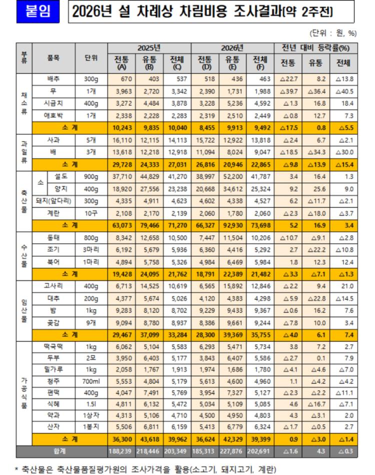 2026년 설 차례상 품목별 차림비 조사<aT제공> |