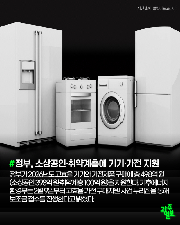 정부가 2026년도 고효율 기기와 가전제품 구매에 총 498억 원(소상공인 398억 원·취약계층 100억 원)을 지원한다. 기후에너지환경부는 2월 9일부터 고효율 가전 구매지원 사업 누리집을 통해 보조금 접수를 진행한다고 밝혔다.