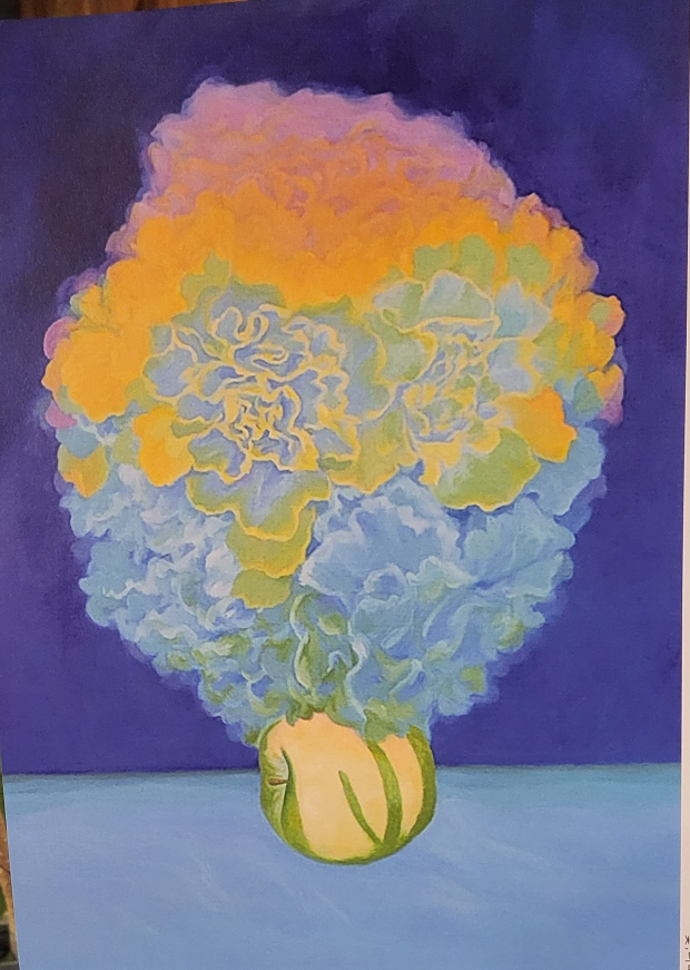 작품 ‘꽃, 너머’는 뭉게구름 같기도, 양배추 같기도 이색적인 형상이다. 꽃을 보고 있으면 자연스레 너머의 풍경, 주위의 형상이나 배경까지도 상상하게 한다.