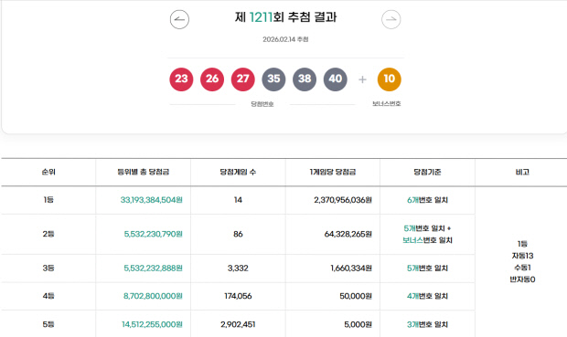 18일 동행복권에 따르면 지난 14일 진행된 제1211회 로또복권 추첨 결과 오천억 복권방에서 1등이 배출됐다. 광주·전남을 포함해 전국에서 총 14명이 1등에 당첨돼 각각 23억 7095만원을 수령하게 됐다.