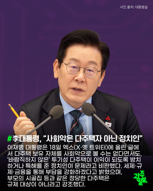 이재명 대통령은 18일 엑스(X·옛 트위터)에 올린 글에서 다주택 보유 자체를 사회악으로 볼 수는 없다면서도, ‘바람직하지 않은’ 투기성 다주택이 이익이 되도록 방치하거나 특혜를 준 정치인이 문제라고 비판했다. 세제·규제·금융을 통해 부담을 강화하겠다고 밝혔으며,부모의 시골집 등과 같은 정당한 다주택은 규제 대상이 아니라고 강조했다.