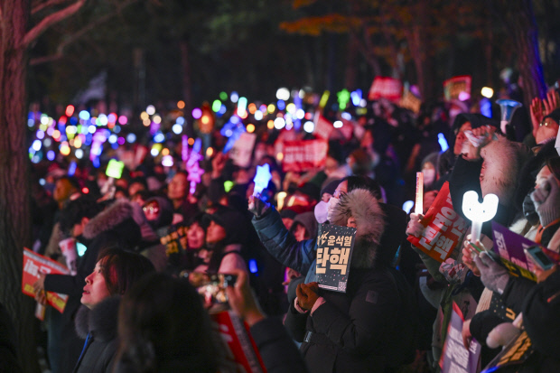 ![]() 지난 2024년 12월 7일 서울시 영등포구 국회의사당 인근에서 열린 탄핵소추안 가결 촉구 촛불집회에서 응원봉을 들고 구호를 외치고 있는 참가자들. <광주일보 자료사진> |