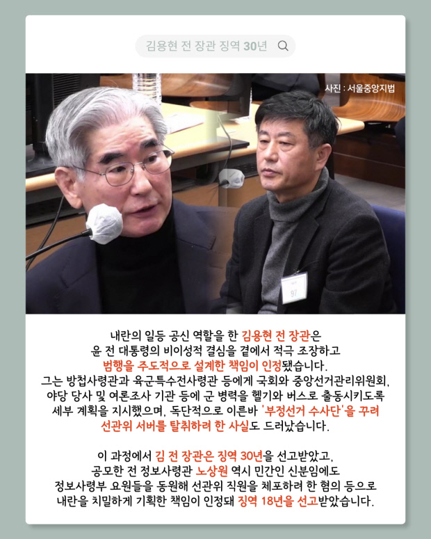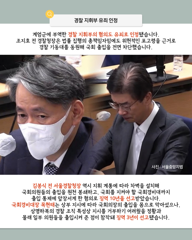 김용현 전 국방부 장관은 징역 30년, 노상원 전 정보사령관은 징역 18년 등 계엄에 가담한 경찰 지휘부에도 중형이 내려졌다.