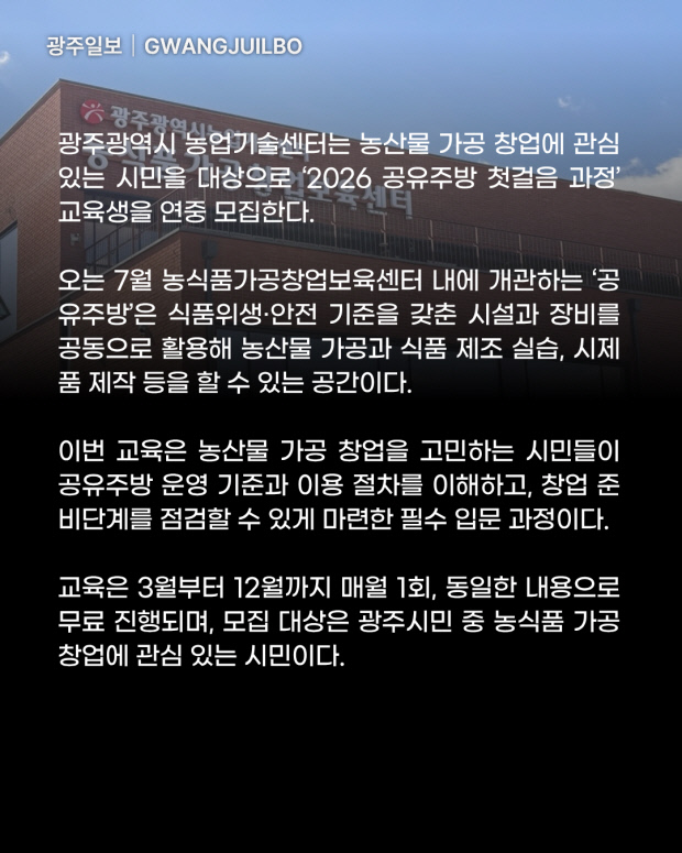 [광클] 광주 농업기술센터, ‘2026 공유주방 첫걸음 과정’ 연중 모집
