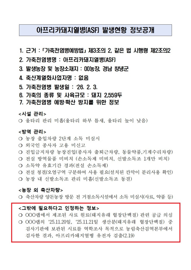 농림축산검역본부에서 공개한 자료 내 ASF 바이러스 감염 사료 정보(맨아래 실선 안).