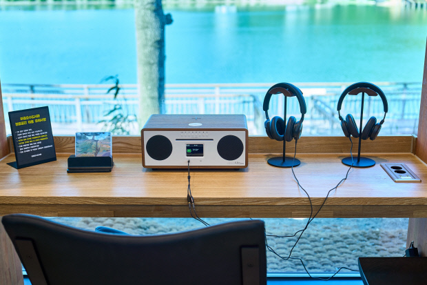 무엇보다 아중호수의 풍광을 끌어 들이기위에 설치한 전면 유리는 ‘물멍’을 즐기기에 더 없이 좋다. 취재차 둘러본 날에도 통창 앞에 놓인 의자에는 고요한 호수를 멍하니 바라 보는 이들이 많았다. 도서관 중앙에는 아예 통유리창을 통해 펼쳐진 ‘호수뷰’존이 자리해 눈길을 끈다. 특히 아중호수 도서관은 음악특화 도서관의 콘셉트에 맞게 음악자료공간, 음악감상공간, 열람공간, 프로그램실, 사무실 등 다양한 공간으로 배치돼 있다. 일반 도서관과 달리 음악 관련 도서와 음반, 체험 콘텐츠 등이 비치돼 독서와 감상을 동시에 즐길 수 있도록 디자인됐다.