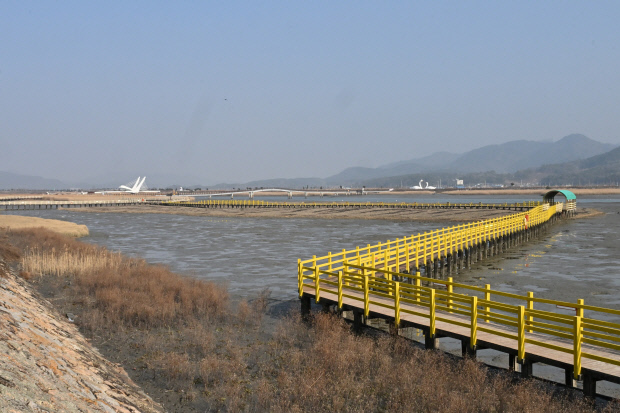 ![]() 강진만 생태공원 데크길, 멀리 큰고니 조형물이 보인다. |