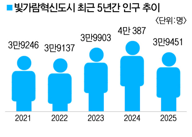 최근 5년간 빛가람혁신도시 총 인구를 보면 2021년 3만 9246명, 2022년 3만 9137명, 2023년 3만 9903명 등 과거처럼 뚜렷한 상승세는 보이지 않았다. 이어 2024년에는 도시 조성 10년만에 처음으로 4만명 선을 돌파하며 5만명 달성 여부가 주목받기도 했지만, 2025년 3만 9451명으로 1년만에 1000명 가까이 급감하는 등 제자리 걸음을 하고 있다.