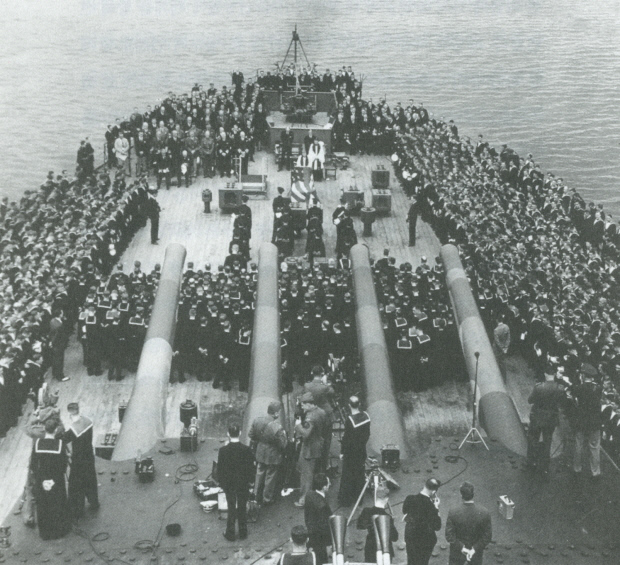 ![]() 1941년 8월 대서양회담 중 영국 전함 함상에서 열린 일요 예배. 루스벨트와 처칠이 참석한 이 예배는 ‘대서양헌장’이 발표된 회담의 일부였다. 회담은 극비리에 진행됐다. |
