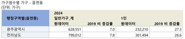 실제 함께 사는 사람을 기준으로 한 가구 수는 2024년 기준 광주·전남 142만8000가구로, 5년 전인 2019년(132만8000가구)보다 7.5%(9만9000가구) 늘었다.