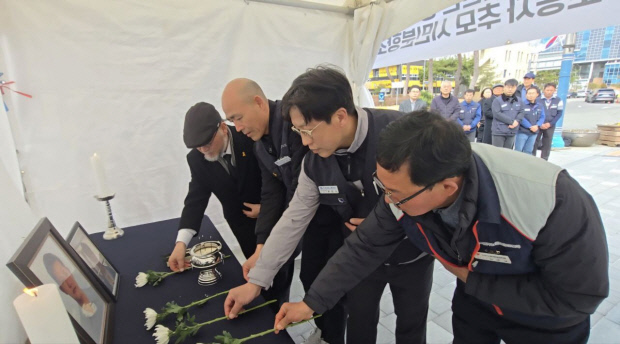 ![]() 영암 대불국가산업단지 내 사망 이주노동자를 추모하기 위해 지난 1일 전남도청 앞에 마련된 시민분향소에서 노동시민단체 관계자들이 헌화하고 있다.