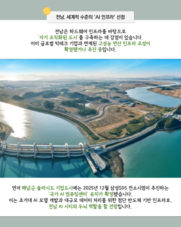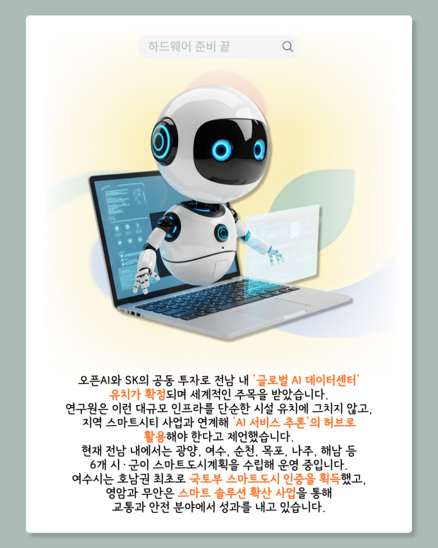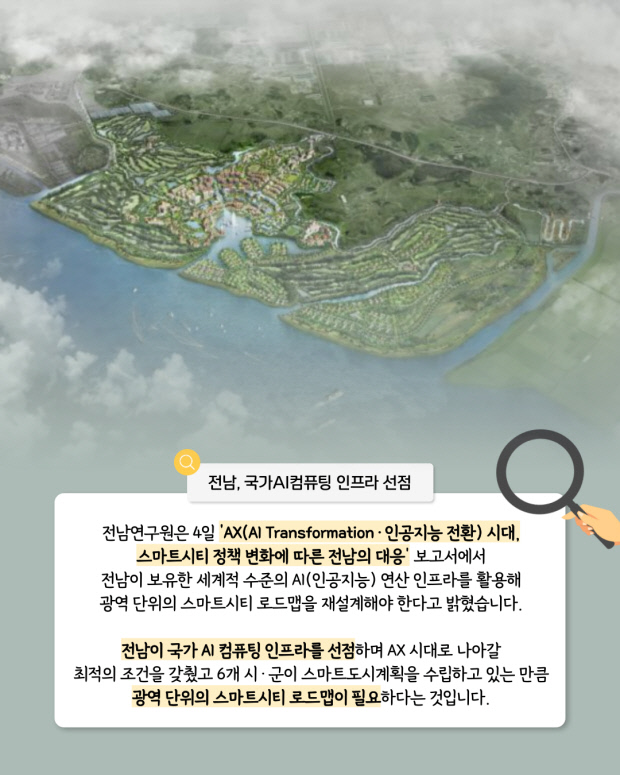 전남연구원은 4일 보고서를 통해 전남이 국가 AI 컴퓨팅센터와 글로벌 AI 데이터센터 유치 등 기반을 확보한 만큼, 시·군별로 추진 중인 스마트도시 사업을 광역 단위로 통합하는 로드맵이 필요하다고 밝혔다.