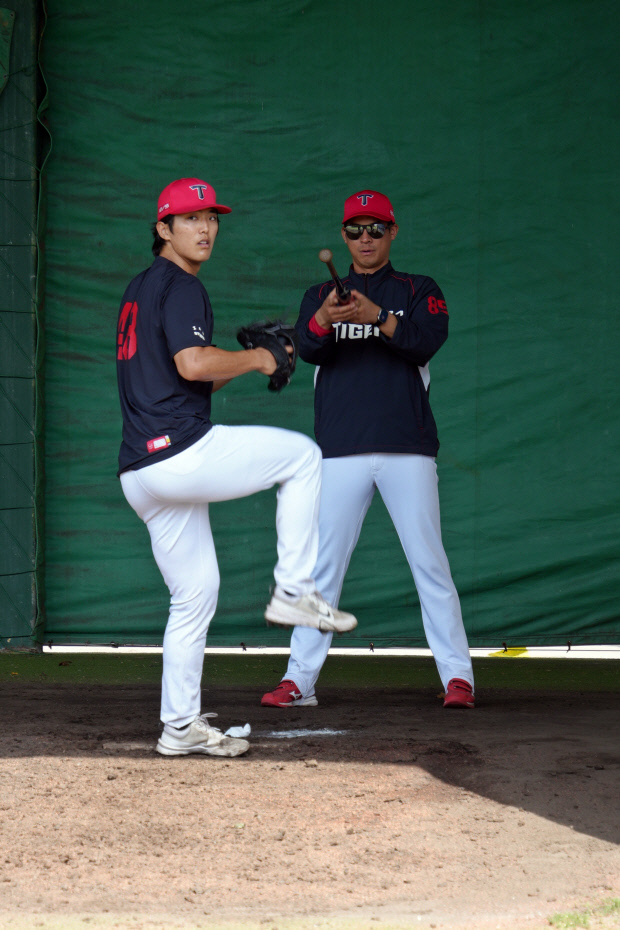 그는 또 “김태형은 지난해에는 신인이라 캠프에서 엄청 조심스럽게 빌드업했다. 올해는 선발 경쟁에 참여시켜 준비하고 있다. 반드시 성장해야 하는 선수다. 자리를 잡아줘야 KIA가 강한 팀 반열에 올라갈 수 있다”며 “김현수도 정말 좋은 자원이다. 고등학교 때 던진 이닝과 쉬었던 것을 감안해서 빌드업하고 있다. 처음부터 만들어서 쓰겠다는 게 아니라 프로에 적응하는 시간을 주고 있다. 시합 때 일부러 불펜에서 기존 선수들이 어떻게 경기 준비하는 지도 지켜보게 했다. 계획한 대로 캐치볼, 트레이닝, 경기 스케줄 정확한 날짜에 맞춰 소화하고 있다. (언론에) 언급되면서 오버페이스 할 수 있지만 제어해 주는 게 코치의 역할이다”고 설명했다.