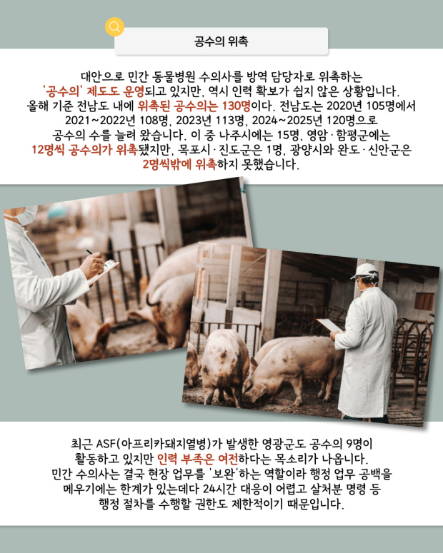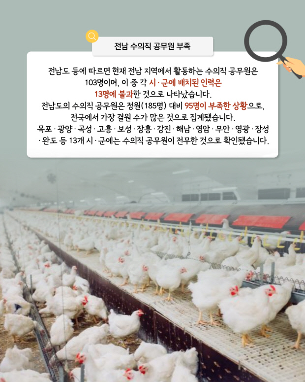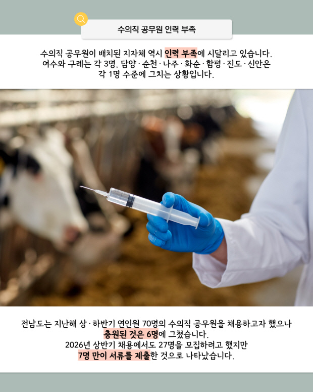 전남도에서 가축 질병 대응을 담당할 수의 인력이 크게 부족해 방역 체계에 대한 우려가 커지고 있다.