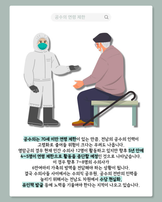 전남도에 따르면 현재 활동 중인 수의직 공무원은 103명으로 정원 185명에 크게 못 미친다. 특히 목포시와 광양시 등 13개 시·군에는 관련 공무원이 한 명도 없는 것으로 나타났다.