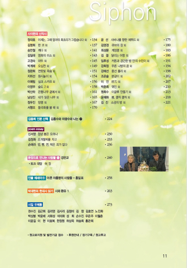 이번 ‘사이펀’ 40호에는 시인들이 좋아하는 시인으로 선정된 강은교, 김준태, 송재학, 송찬호, 신용목, 이규리, 이장욱, 이하석, 조용미, 진은영, 천양희, 황인찬 시인 등 12인의 신작 및 근작시를 수록했다.